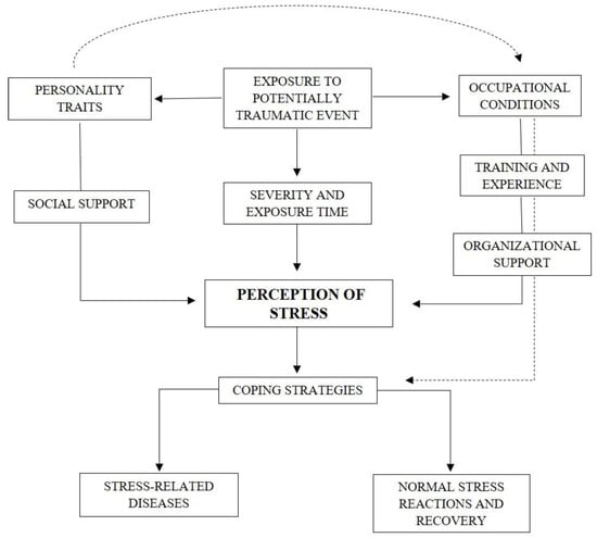 The first factor of the proposed model is exposure to a potentially traumatic event, a precondition for stress reactions [47,53,55,59]. Indeed, several studies have shown that the source and context of the trauma were related to increased PTSD symptoms (p <0.05) [1,12,20,28,46]. Then, the severity and exposure time enter in this model, since trauma load [10,45] and the number of critical incidents [14,25,31] were significantly related to PTSD symptom severity (both p range <0.01 to <0.001). Notably, personality traits such as extraversion (p <0.001) [40], impulsivity (p = 0.003) [21], optimism (p <0.05) [40], self-forgiveness (p <0.001) [18], distress tolerance ( p<0.001) [50], and resiliency (p <0.001) [24,33,55] seem to affect all other variables which influence the perception of stress, thereby affecting the choice of coping strategies. Moreover, personality traits were directly associated with the choice of coping strategies (p range <0.05 to <0.001) [21,36,40,44], which can lead to either stress-related diseases or normal stress reactions and a recovery process. However, the professional aspects, which include occupational conditions [23,24,34,38], training and experience [12,14,17,29], and organizational support [36,41,44], may assume a relevant role in the subjective appraisal of the event and, subsequently, in the choice of coping strategies to deal with stress.