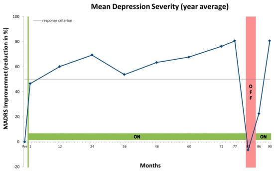 In 2012, DBS surgery was conducted within a study []. DBS electrodes were implanted bilaterally in the supero-lateral medial forebrain bundle (slMFB) to stimulate this brain region in order to treat the chronic, severe and treatment-resistant depression []. In the first week after the implantation, depressive symptoms were immediately reduced significantly. In the following years the patient showed a stable reduction of depressive symptoms (mean Montgomery–Åsberg Depression Rating Scale (MADRS) reduction over seven years in percent = 63.56 (17.40)) (see Figure 1). Although depressive symptoms fluctuated over time, depression severity never reached pre-implantation levels (see Figure 2). Furthermore, the patient stated that depression severity never exceeded baseline levels after DBS surgery (MADRS sum at baseline = 31 points).