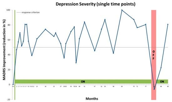 (2) Intended Cessation: One case with an intended DBS discontinuation in an open setting (patient and clinician were aware of stimulation status) is reported []. In this case, slMFB stimulation had to be switched on again four days after DBS switch off due to a rapid worsening of depressive symptoms. The patient had shown a stable response to DBS treatment for two and a half years before. Nocebo effects and effects of negative expectations are discussed in this case. Nonetheless, it seems rather improbable regarding another single case that showed a massive worsening of depressive symptoms following SCG DBS discontinuation in a blinded setting []. Here, the patient with the most robust and best-sustained clinical response showed an increase of depressive symptoms as well, although antidepressant effects could be sustained longer. A progressive increase of depressive symptoms including loss of energy and drive is described over a period of three to four weeks following the cessation of stimulation. In both cases, antidepressant effects could be re-captured rather fast after the re-onset of stimulation within 24 to 48 h.