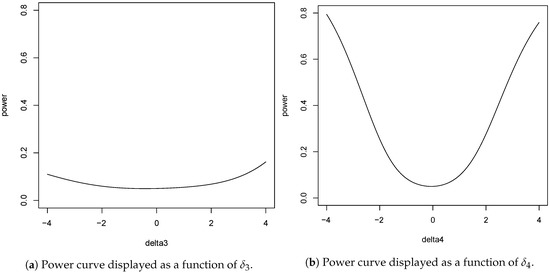 Note that Figure 2 shows the power function of the overall test which has 57 degrees of freedom or free parameters. Thus, assuming only one of the parameters to deviate from 0 while assuming all others to be 0 will in general not yield high power values. For instance, as can be seen in Figure 2, the power is approximately only if given all other parameters being set to 0, and it is even lower if given, again, all other parameters being 0. Surely, if one assumes more than one parameter deviating simultaneously from 0 the power will generally be larger.