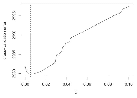 Cross-validation error in the ISRD-2 study. The selected value of  corresponds to the vertical dashed line.