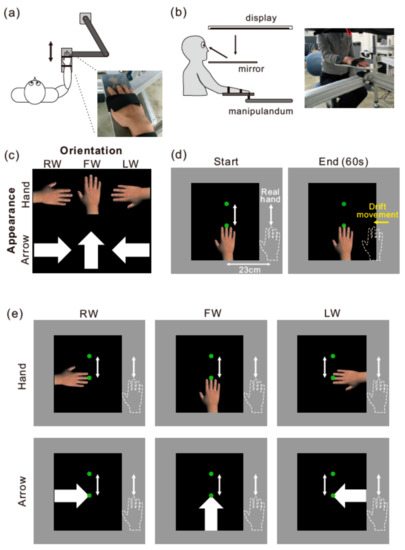 The current study developed a novel method using a horizontal planar manipulandum. The participants’ hand position in the forward-backward direction reflected the position of a visual image on a monitor, whereas the hand position in the lateral direction did not (i.e., the lateral position of the image was fixed). Participants were instructed to continuously move the visual image between two targets backward and forward using active hand movements for one minute. The appearance (arrow or hand) and orientation (forward (FW), leftward (LW), or rightward(RW)) of the visual image were manipulated. It was hypothesized that if the direction of the required hand actions (i.e., back and forth movements) was incompatible with that of the visual image (i.e., rightward or leftward image), the hand position in the lateral direction would drift toward the directional cue of the image during the task. This phenomenon is referred to as a drift movement hereafter.