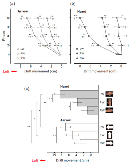 Time course of drift movements during the task for the arrow (a) and hand image (b). Different symbols show the orientations of the image (LW: leftward; FW: forward; RW: rightward). Error bars represent ± 1.0 standard error. Significant differences from the values of phase 1: ** p < 0.01, * p < 0.05. Significant differences from the values of the forward orientation in each phase: †† p < 0.01. (c) Final drift movements of the hand (gray) and arrow images (white) are shown against the orientations of the image. Positive values indicate leftward drift movements. Error bars represent ± 1.0 standard error. ** p < 0.01, * p < 0.05.