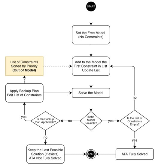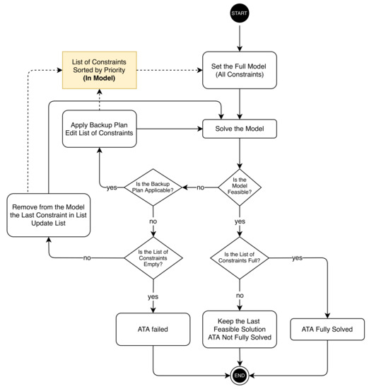 Once the priority order and backup plans have been set, the specifications must be passed to the solver in the proper language, and the software may provide a solution that fulfills all the requirements. More frequently, even if the requirements are well specified, correctly written, and individually feasible, no solution for the model including the entire set of constraints exists (i.e., the model is infeasible). Even worse, the solver may take an unacceptably long time to process and solve the model; this is the case of an ATA instance that is too large.