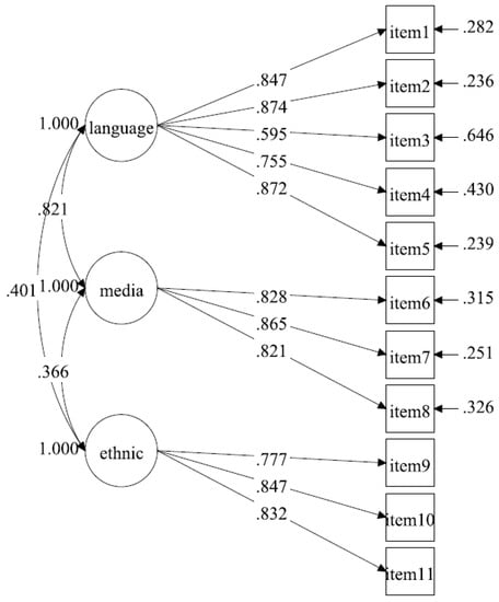 Reliability measured by Cronbach’s alpha to examine internal consistency of the SAS instrument was 0.89 for language use, 0.88 for media use, and 0.81 for ethnic social relations, indicating high internal consistency of our version. Omega coefficient ranged 0.86 to 0.90. Spearman correlation coefficients, calculated to examine the inter-relationships of the three subscales (factors), ranged from 0.30 to 0.72, which is acceptable. All the correlations were significant, and the strongest correlation was found between language use and media use (r = 0.72) (Table 3).