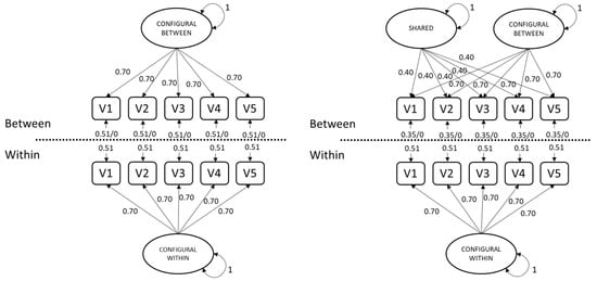 The cross-level invariance of factor loadings is necessary for a meaningful interpretation of factors at the two levels [1,6,7,8,9,10,11,12]. The left panel of Figure 1 shows a population configural model in which each indicator’s factor loading is equal across levels.