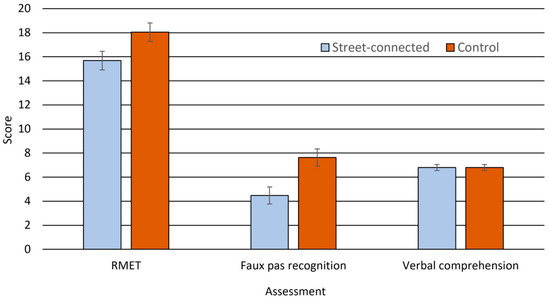 For the verbal comprehension scores in the Faux Pas Test, the street-connected sample (n = 37) scored a mean of 5.9 (SD = 1.7), which was lower than their control sample (n = 26), who scored a mean of 7.8 (SD = 0.4). This was a significant difference, Mann–Whitney U = 859.00, p < 0.01, median score difference = 2 points. As the comprehension difference would confound the interpretation of measures of theory of mind ability, in the next step, paired-sample analyses were implemented to control for differences in verbal comprehension.