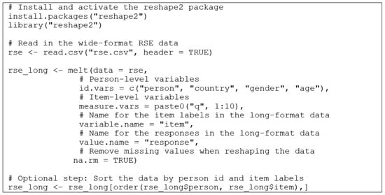 In our example, we use data from the RSE scale (rse.csv) that consists of 961 respondents’ answers to 10 items based on a 4-point Likert scale (ranging from 0 strongly disagree to 3 strongly agree). In the data, responses to negatively-phrased items (i.e., items 3, 5, 8, 9, and 10) are reversed-coded to place all the items in the positive direction (i.e., higher response values are likely to indicate higher self-esteem unless threshold locations are disordered). The data also contain a pseudo identification number and three demographic variables (i.e., country, gender, and age) for each respondent. To prepare the data for subsequent analyses, we use the melt() function in the reshape2 package [] and transform the data from a wide format to a long format (see Figure 1).