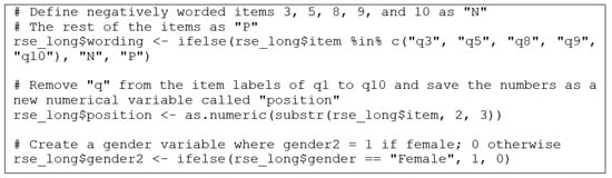 In the second step, we use the long-format data to define item-level predictors (i.e., item properties) based on whether the items were negatively worded (denoted with N) or positively worded (denoted with P) and the position of the items in the RSE scale (i.e., 1 to 10). Finally, we create a binary numerical version of the gender variable that will be used as a person-level predictor (i.e., a person property) in the explanatory IRT models (see Figure 2).