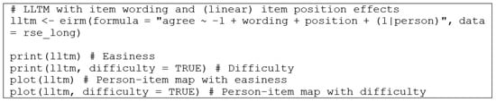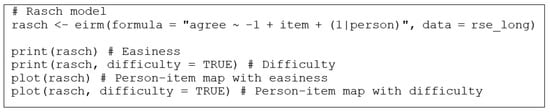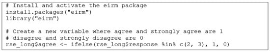 The following examples show how to use item and person properties to explain dichotomous responses in the long-format RSE dataset. First, we install and activate the eirm package. The eirm package version 0.4 is currently available on the Comprehensive R Archive Network (CRAN; https://cran.r-project.org/ (accessed on 28 July 2021) and can be downloaded using the install.packages() function in R. We also create a new response variable called “agree” by recoding the response categories of strongly agree and agree as 1 and strongly disagree and disagree as 0 to obtain a binary variable of agreement (see Figure 3). We will use the new response variable to demonstrate explanatory IRT models available for dichotomous responses. We will begin with the Rasch model (i.e., a fully descriptive model) as the baseline model and then continue with LLTM (i.e., item explanatory), latent regression Rasch (i.e., person explanatory), and latent regression LLTM (i.e., doubly explanatory).