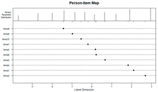 Note that Figure 5 is essentially a modified version of the person–item map that the plotPImap() function in the eirm package [] produces for the Rasch model. The x-axis shows the latent trait continuum, the y-axis shows the item labels, the locations of the points (on the x-axis) indicate the easiness parameters for the items, and the bars at the top of the plot show the distribution of the latent trait estimates. Users can modify figure aesthetics such as labels of the x and y axes and the figure title.