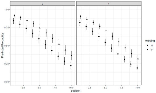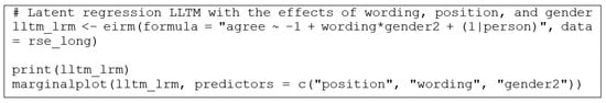 In addition to printing the model output, the marginalplot() function can be used to visualize the marginal effects in the latent regression LLTM model. This function uses the ggeffects package [] to calculate the marginal effects and the ggplot2 package [] to create a plot. The marginal effect plot will show the predicted probability of agreeing with the RSE items because of the interaction among item position, wording, and gender (see Figure 8).