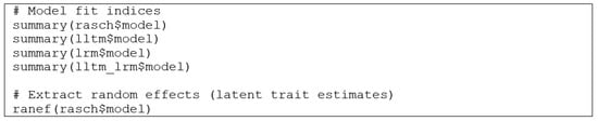 Although the eirm() function returns the model output as an eirm object, it still retains the original model output from the lme4 package (i.e., a glmerMod object). Therefore, the helper functions designed for the lme4 package can be used to extract additional information from the estimated models (see Figure 10). For example, relative model fit indices, such as the Akaike information criterion (AIC), the Bayesian information criterion (BIC), and deviance statistics, can be extracted from the models using the summary() function in R, and the ranef() function can be used to extract the random effects (i.e., latent trait estimates).