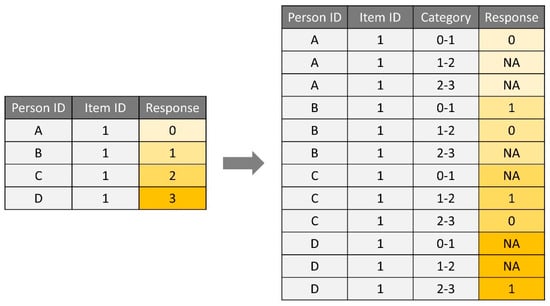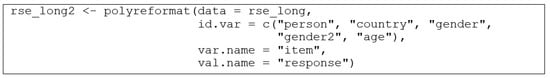 As an extension of the lme4 package, the eirm package also assumes that item responses follow a binomial distribution. One implication of using a binomial distribution is that the dependent variable (i.e., item responses) must be dichotomous. Therefore, polytomously-scored items with ordered response categories (e.g., Likert-scale items) cannot be used as a dependent variable. To tackle this problem, the polyreformat() function in the eirm package allows users to reorganize polytomous responses by creating a set of pseudo-dichotomous responses from the original (ordinal) responses. The polyreformat() function elongates the long-format data by adding new rows depending on the number of response categories in the polytomous items (see [] for more details on the polyreformat procedure). It must be noted that the polyreformat() function assumes ordered response categories (i.e., ordinal scale), and thus polytomous responses with nominal response categories should not be restructured using this function. In the following example, we use the RSE items with response categories of 0 (strongly disagree) to 3 (strongly agree) to illustrate how the polyreformat() function reorganizes polytomous responses (see Figure 11).