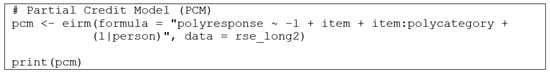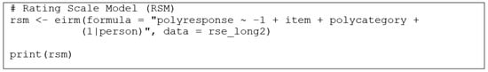 This model yields a unique location parameter for each item (based on “item”) and a set of threshold parameters that are fixed across all the items in the RSE scale (based on “polycategory”). Figure 13 shows the R codes to estimate the RSM.