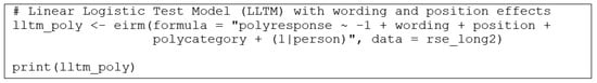 There are several limitations when using the eirm package to estimate explanatory IRT models. First, the eirm package is only capable of estimating explanatory IRT models based on the Rasch family of models. Therefore, explanatory IRT models that involve discrimination parameters (e.g., LLTM with discrimination parameters, Generalized Partial Credit Model, and Graded Response Model) cannot be estimated using the eirm package. The mirt package [] and R packages focusing on latent variable modeling could be viable alternatives when estimating more complex versions of the explanatory IRT models presented in this tutorial. A second limitation of the eirm package is that despite employing a different optimizer to speed up the estimation process, computation time may increase substantially depending on the number of items and persons in the response data and the number of parameters to be estimated in the model (i.e., model complexity). Third, the eirm package only yields points estimates for model parameters. Users who are interested in obtaining posterior distributions of model parameters in a Bayesian setting can use other R packages, such as blme [] and brms []. Finally, the eirm package does not include any functions to simulate response data based on explanatory IRT models. For users who are interested in Monte Carlo simulations with explanatory IRT models, other R packages such as TAM [] and eRm [] may be better alternatives.