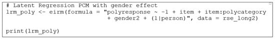 Our final example demonstrates a latent regression PCM with gender (gender2) as a person property (see Figure 16). The model estimates unique threshold parameters for the items (based on “item” and “item:polycategory”) and a gender effect (based on “gender2”). The formula for this model is as follows: