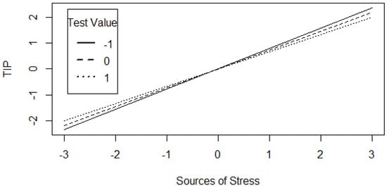 There was an interaction between the test value and sources of stress, , , . Probing of the interaction showed that across values of the test value, the simple slope of sources of stress was positive, but this relationship was weaker as the test value increased, Table 2. This relationship can be visualized with a plot of simple slopes produced by the plotProbe() function, see Figure 2 for an example.