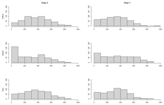 Overall frequency distributions of responses across all 500 iterations to the individual modules with items of three difficulty levels in stages two and three for a condition with 1000 respondents and 63 items. There were no DIF or impact effects, and the WL estimator was used for person parameter estimation.
