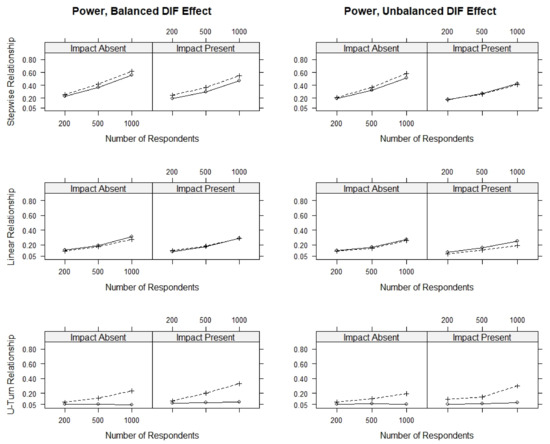 For all three tests, we found that the power was overall comparable for corresponding conditions with and with without ability differences, that is, conditions with and without impact. When comparing the power of the score-based tests and the linear logistic regression test, we found that the score-based tests had slightly higher power against the stepwise DIF effect, comparable power against the linear DIF effect and much higher power against the U-turn DIF effect.
