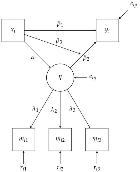 In addition to specifying path models, the factored regression framework can incorporate latent variables and other measurement models. To better explicate this idea, let us modify the mediation model in Equation (14) to allow the mediator to be a latent endogenous variable, .