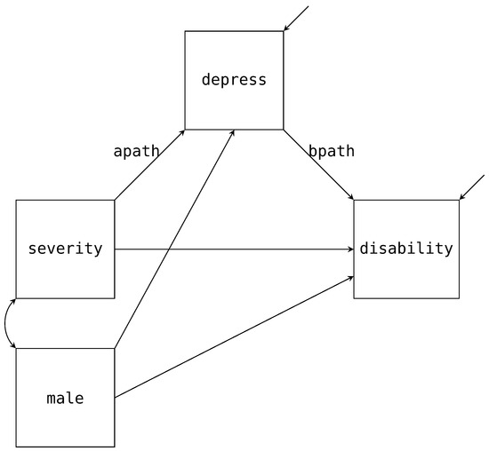 First, we will estimate is a single mediator model that investigates if depression (depress) mediates the effect between pain severity (severity) and the psychosocial disability construct (disability) while controlling for biological sex (male). We provide the path diagram for the model of interest in Figure 3 with the mean structure excluded. To construct the factor regression, we first factor the joint distribution for disability and depress conditional on severity and male.