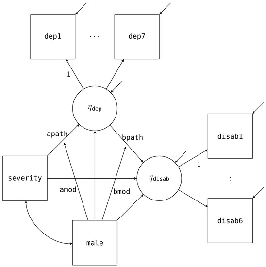 eta_disab ∼ eta_dep@bpath severity male eta_dep*male@bmod;