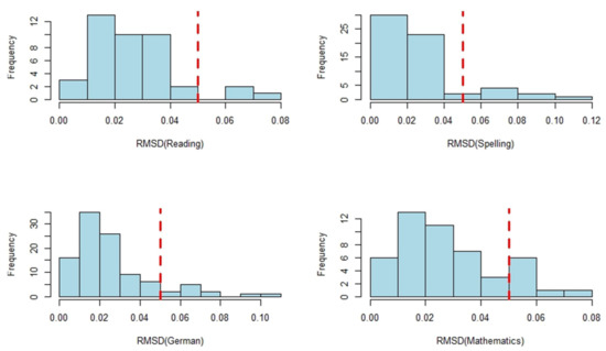 RMSD is used as an item-fit statistic for examining item parameter invariance in various large-scale assessment studies (e.g., the PISA, the Organization for Economic Cooperation and Development [40], and the Program for the International Assessment of Adult Competencies (PIAAC)). The general approaches (e.g., chi-squared and the likelihood ratio approaches such as Bock’s X2 [41], Yen’s Q1 [42], Orlando and Thissen’s S-X2 [43,44], Wright and Masters’ infit and outfit mean-square (MSQ), infit and outfit to statistics [45], Orlando and Thissen’s S-G2 [43]) in the literature have inflated type I error rates and lack of power to detect item misfit, especially for large sample sizes [37,46,47]. RMSD can be used as a test statistic that outperforms other item-fit approaches [37] with a large sample size.