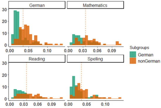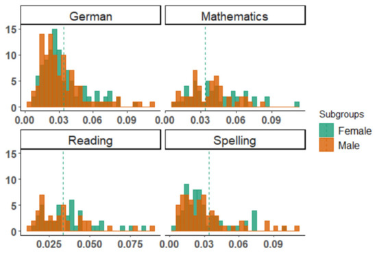 Misfit item values between gender groups were generally not very different, but they were considerably different between German and non-German students. Non-German students had the most misfit items on each test. According to the results that we obtained, language-specific DIF was greater than gender-specific DIF on the VERA tests without sampling weights. Consistent with previous studies [35,71,72]), female students performed better than male students on the reading and spelling tests, and in contrast to these tests, male students performed better than female students on the mathematics tests. The pattern was different for the language groups; on the overall tests, German students were more successful than non-German students, and non-German students tended to be classified at the lower achievement levels.