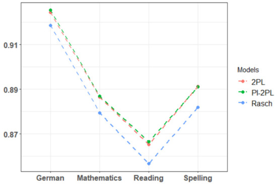 After investigating misfit items and classifications of the students in terms of their proficiency levels, we evaluated the internal reliability of the test scores for all models. These results are presented in Figure 4 and Figure 5. Reliability was computed for gender and language groups, and these values were compared based on the Rasch, 2PL, and PI-2PL models. The reliability of the reading test for gender groups was 0.855 (Rasch), 0.863 (2PL), and 0.864 (PI-2PL). According to the results, the PI-2PL and 2PL models provided higher reliability values than the Rasch model for every test. The reliability of the German test using the PI-2PL model was the highest (0.925); however, the values that were estimated based on the 2PL and PI-2PL models were very close to one another. Because the numbers of the items on the German test (n = 103) and the spelling test (n = 62) were greater than those for the reading (n = 41) and mathematics tests (n = 48), the internal reliability of the German and spelling tests was also greater than that of the reading and mathematics tests. The reliability values for the reading test with language misfit were 0.857, 0.865, and 0.867 for the Rasch, 2PL, and PI-2PL models, respectively. The Rasch model provided the lowest reliability values. Moreover, similar reliability values were computed with the 2PL and PI-2PL models. Because 0.70 was used as a cut value, the reliability estimated with all models was greater than 0.70, and the reliability values of all tests with each model were considered acceptable.