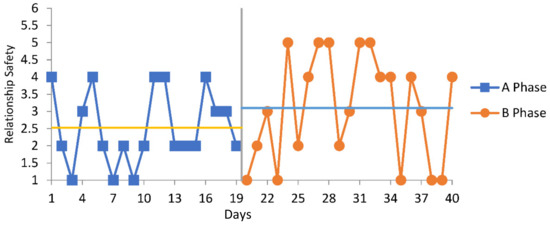 While a complete data set was collected for the two included participants, it should be noted that due to the impact of COVID-19 (e.g., service closure) the final survey responses and measures were fast-tracked over a fortnight. Following randomized start points, P1’s total exposure to the program was eight weeks and P2’s was six weeks. Table 4 presents the descriptive statistics and effect sizes for the daily measures for participant one (P1) and participant two (P2). Graphical representations of changes between the phases over time are shown in Figure 1, Figure 2, Figure 3, Figure 4 and Figure 5. No variance was found across the self-reported relationship safety measure for P1 (e.g., all data points were reported as 4 out of 5 on the Likert scale) therefore these were excluded from the AB analysis, as responses without variance result in the inability to estimate missing data, standard deviation or effect size. P2’s relationship safety knowledge indicated a small mean improvement; P1 and P2 had a small improvement across mean daily emotion regulation strategies; and psychological wellbeing was relatively static for P1, and increased from baseline to intervention phase for P2. However, no results were statistically significant.