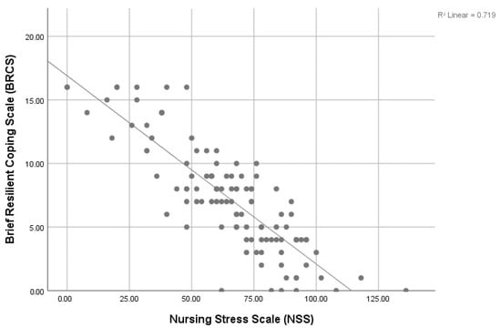 Considering the Nursing Stress Scale and Brief Resilience Coping Scale, Table 2 (Figure 2) shows a severe stress level in 50.4% of the studied sample compared to 41.6% who reported average coping abilities. Additionally, there was a highly statistically strong negative linear significant correlation between the NSS and BRCS (p ≤ 0.01).