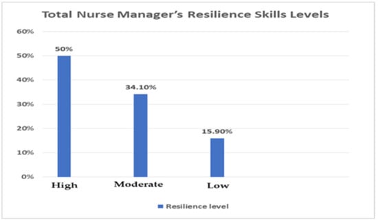 Interestingly, the current study findings revealed half (50%) of the nurse managers had high resilience skills. From the researchers’ point of view, this means that nurse managers face COVID-19 pandemic challenges in an adaptive way, showing great levels of feelings of freedom and a sense of uniqueness, a higher ability to believe in themselves and in their abilities, showing a balanced perspective concerning their own life and experiences, a higher persistence in the face of adversity or a threatening situation, and great ability in understanding the meaning of life and their contributions. In addition, [] emphasized that resilient nurse leaders are not only able to survive hardship and adversity, but also have the ability to exhibit behaviors that enhance the growth of their peers. This result was supported by the researchers [,] in Saudi Arabia, where a high level of resilience was reported among head nurses with a mean value of 4.03. In addition, Juan, S.J. et al., 2021 [] in China found the majority (83%) of head nurses had high resilience levels. Meanwhile, Afshari, D. et al., 2021 in Iran found that a low percentage (12%) of head nurses had high resilience levels.