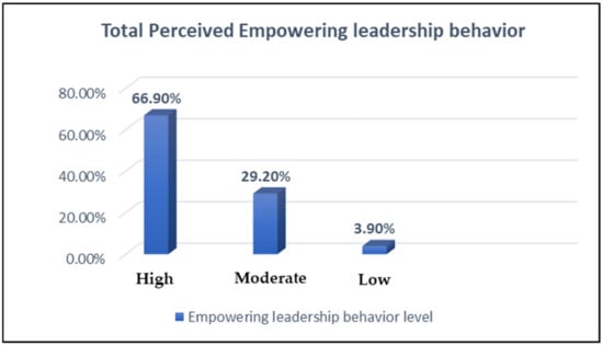 The current study demonstrated that two-thirds (66.9%) of staff nurses perceived a high level of their nurse manager’s empowering behavior during COVID-19. In comparison, 29.2% of them reported that their nurse manager had a moderate level of empowering behavior and only 3.9% perceived them as had a low level of empowering behavior during COVID-19. From the researchers’ point of view, nurses feel empowered when their nurse leaders show confidence in their abilities to perform. Furthermore, [] mentioned that when nurses feel important by being able to make decisions without seeking approval from their leaders, they feel empowered to perform. This result was supported by [,,] and Yassin, N.M. et al., 2021 [] who reported that nearly half (45.2%) of the staff nurses reported that their head nurses had a high level of overall empowering behavior, while more than one-fifth 22.8% of them reported that their head nurses had a moderate level of overall empowering behavior as perceived by staff nurses. Along with the present study, Mudallal et.al. 2017 and Kim et.al. 2018 [,] confirmed these results in their studies in which staff nurses perceived their head nurses had a high level of empowering behavior and reported their feeling of empowerment by their head nurses based on their interaction with them. Meanwhile, research by Rangachari and Woods 2020 [] contrasted present study results and found that 82% of staff nurses perceived low levels of empowering leader behavior during COVID-19, and added that significant support for emotional grief during a pandemic can lead healthcare workers to believe that their organization puts their own employees first, which, in turn, can make them feel physically and psychologically safe and empowered to talk about safety issues and the solutions taken on the front lines.