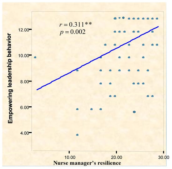 Along with the present findings Suryaningtyas, D. et al., 2019 and Park, J. et al., 2017 [,] confirmed these results by discovering significant correlations between empowering leader behavior and resilience, where head nurses who had a higher level of empowering leader behaviors also had a higher ability and skill to be resilient and overcome challenges. Likewise, Besuner 2017 [] found statistically significant positive associations among self-efficacy, psychological empowerment, personal resilience, and organizational resilience. Additionally, Zehir and Narcıkara 2016 [] found a meaningful relationship between authentic leadership and resilience whereby authentic leaders can influence follower performance and empower staff nurses through demonstrating leading-by-example behaviors and commitment to work, in addition to work of Arshad, A. et al., 2021 [] whose findings agreed with the present study results. Thus, from the researchers’ point of view, resilience in nursing is vital in enabling head nurses to cope with or manage work stress during their work and empowering their staff nurses to make positive changes and achieve the goals of the organization that can influence nurses’ ability to practice in a professional manner, ensuring excellent patient care quality and positive organizational outcomes especially during COVID-19.