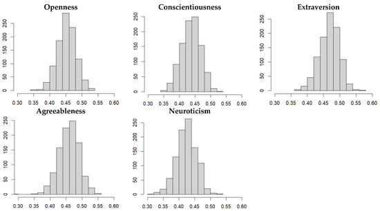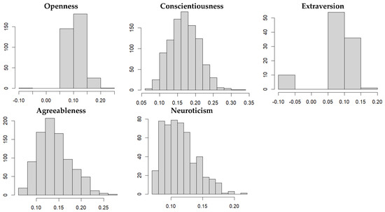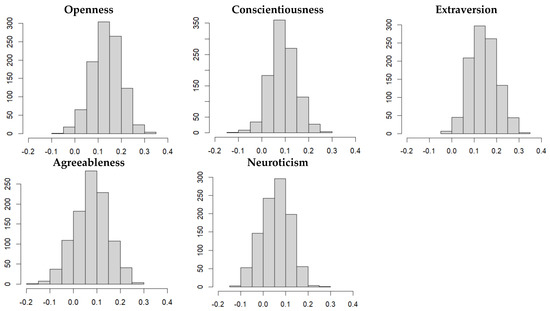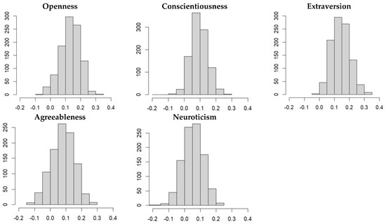 Compared to previous results, the performance of the model in the validation data sets was low, presenting larger variability than the model performance in the training data sets due to the smaller size of the validation data sets. Again, we present here the results of the R measures to make them more comparable with previous results. A mean R measure of 0.14 (SD = 0.06, Mdn = 0.14, Min = −0.08, Max = 0.33) was found for openness, an R = 0.09 (SD = 0.06, Mdn = 0.09, Min = −0.12, Max = 0.26) for conscientiousness, an R = 0.14 (SD = 0.06, Mdn = 0.14, Min = −0.05, Max = 0.34) for extraversion, an R = 0.08 (SD = 0.07, Mdn = 0.08, Min = −0.19, Max = 0.27) for agreeableness, and an R = 0.06 (SD = 0.06, Mdn = 0.06, Min = −0.11, Max = 0.26) for neuroticism. Figure 2 presents the distribution of the performance of the multiple linear regression models (R measures) in the validation data sets. There are some trials where the model performance was similar to the expected effect size in this area of research (e.g., [7]), but the central tendency of the present results was nearly zero. Also, many trials presented negative and near-to-zero R measures. Thus, the estimated models were lacking in generalizability to other samples, which means that the results that are estimated in the training data sets could be overfitted or idiosyncratic to the data (please note that we are using relatively simple models such as multiple linear regression models) and their estimations cannot be generalizable to other samples.