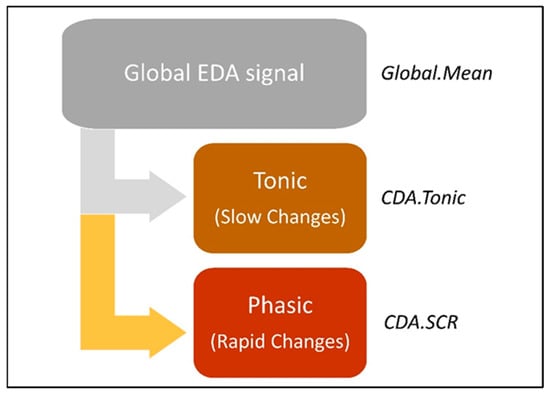 We were primarily interested in the average phasic driver, the mean tonic activity, and the mean SC value per condition. Hence, the variables CDA.SCR, CDA.Tonic, and Global.Mean were selected as primary variables of interest concerning the EDA. This is illustrated in Figure 1.