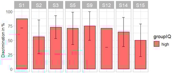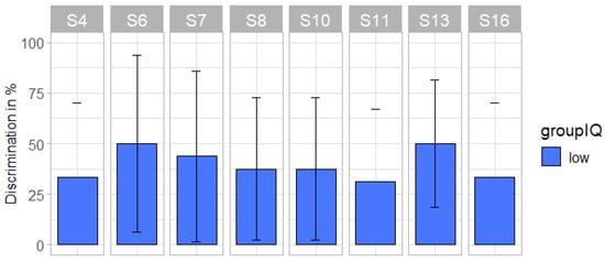 The results showed that all contrasts but /iː/–/e/ could be discriminated better by the high IQ than the low IQ group. For the low IQ group, all contrasts but /iː/–/e/ were discriminated below chance (i.e., 50%). In addition, /iː/–/e/ was the most accurate contrast, followed by /ɔː/–/ɒ/, /ɑː/–/ʌ/, /uː/–/ʊ/, /ɪ/–/iː/, and /æ/–/ɑː/. For the high IQ group, only one contrast was discriminated below chance, namely, /ɑː/–/ʌ/. Moreover, similarly to the low IQ group, /iː/–/e/ was the most accurate contrast, followed by /ɔː/–/ɒ/, /ɪ/–/iː/, /uː/–/ʊ/, /æ/–/ɑː/, and /ɑː/–/ʌ/, which was the least accurate one. It can be observed that the discrimination of some contrasts differed between the two IQ groups. Figure 1 illustrates the correct discrimination percentages and SDs for all contrasts in the low and high IQ groups. Figure 2 and Figure 3 illustrate the discrimination of contrasts by each subject in the low and high IQ groups.
