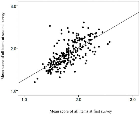 The reliability of the instrument was verified using a test-retest method. Cronbach’s alpha coefficient for all items in the first survey was 0.821 and that in the second survey was 0.885 (excluding the additional items). The ICC (1, 2) for all items was 0.795 (95% CI: 0.735, 0.842) (Table 2).