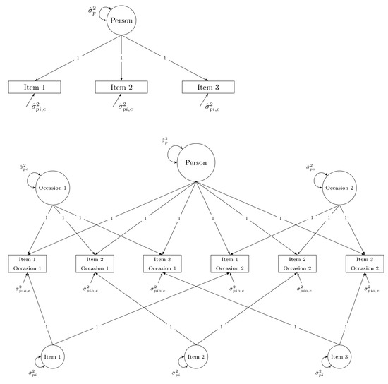 - Vispoel, W.P.; Xu, G.; Schneider, W.S. Interrelationships between latent state-trait theory and generalizability theory within a structural equation modeling framework. Psychol. Methods 2022, 27, 773–803. [Google Scholar] [CrossRef]
