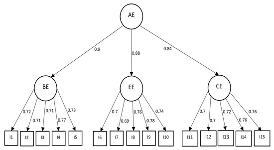 The AVE estimates were calculated, in addition to the factor-loading indices, to strengthen the evidence for the construct validity. Following the Fornell–Larcker criterion. AVE values of 0.7 or higher were deemed highly satisfactory, and a value of 0.5 was considered acceptable. The AVE values for the BE, EE, and CE were 0.531, 0.539, and 0.530, respectively.