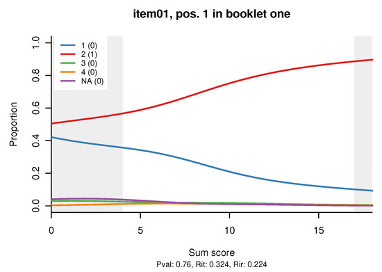 The distractor plot shows a non-parametric regression of the relative frequency of each response alternative, including non-response, on the sum score for the booklet. A separate plot is produced for each booklet that contains the item. The distractor plot for the first item in our small example is shown on Figure 1. The title of the plot shows the item ID, in what booklet the item is featured, and in what position. At the bottom, we see the basic CTT statistics: proportion correct (Pval), item-total correlation (Rit), and item-rest correlation (Rir); the strange acronyms come from practice, including the irritating habit of calling the proportion of correct responses ‘p-value’. The legend shows the responses and the scores that they are assigned—in our example, 2 is the correct response earning an item score of 1, while all other responses are scored 0.
