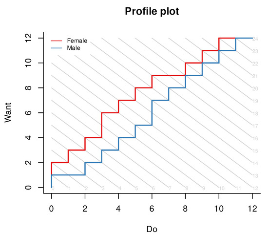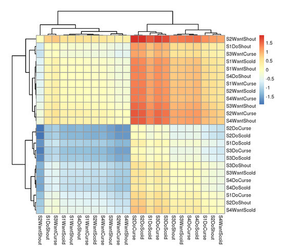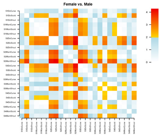 The easiest way to understand these matrices is by plotting them as heatmaps. For example, Figure 3 displays a heatmap of the unstandardized differences (Delta_R) produced with the code below. The default clustering of rows and columns readily reveals two groups of items defined primarily by the mode of behavior: ‘Do’ vs. ‘Want’. The relative difficulty of Do and Want items is different for men and women.