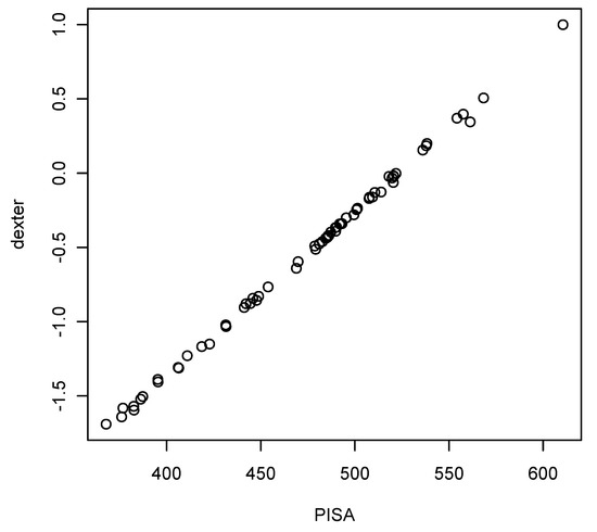Figure 7 compares the country means of one set of plausible values as estimated by PISA and by dexter. Given that PISA estimates item parameters by MML while dexter uses CML, and that plausible values are computed by different methods (both of which involve random numbers), the correspondence is more than decent.