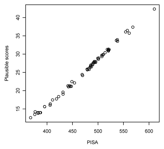 The country means compared on the plot are calculated from plausible values obtained from a common IRT model for all participating countries. Numerous studies such as Refs. [49,50] have found evidence of DIF in large scale international assessments, and some of them have been quite critical of the current practice, which typically involves fitting country-specific IRT model, removing items with DIF exceeding some prespecified criteria, and then fitting a common model for further analysis and comparison. Zwitser et al. [31] argue that DIF is a natural result from the national efforts to improve education, and its study may be a more rewarding exploit than obtaining a completely DIF-free comparison. They propose an approach using country-specific IRT models that is easy to realize in dexter with the plausible_scores function. The following code selects responses to items that have been asked in all participating countries, fits a different IRT model in each country, and computes plausible scores (there are also some trivial adjustments for items that did not have any correct responses in a few countries). As explained in Section 1, plausible scores are sum scores over all items, where item scores for the items actually asked to the person under the incomplete design are retained ‘as is’, while item scores for the remaining items are simulated from plausible values.