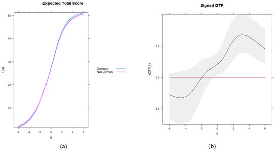 The real data used for this study consisted of VERA 8 (Vergleichsarbeiten) [30], a mathematics test that was administered to 8th grade students in Germany. The results of the VERA tests were used to inform teachers about their students’ relative performance in Germany. The DIF effect of the VERA 8 mathematics test (Booklet 2) was examined using the DTF measures that were also used in the simulation study. Language groups (German, non-German (those students whose everyday language is not German)) were used to evaluate DIF at the item and test levels. Since the symmetrical treatment of groups can be advantageous when evaluating DIF across two groups, in the study, weighted sampling was used, and the sample sizes of both the German and non-German students were equal, at 1248. Before the DTF analyses, DIF analyses were performed with multigroup IRT, and the uniform and non-uniform DIF items that were derived from slope, intercept, and both slope and intercept parameters are reported in Table S2, Table S3, and Table S4, respectively.