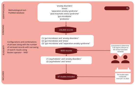 The search strategy used by the authors included the use of relevant keywords related to the topic of interest, such as “gut microbiota”, “microbiome”, “dysbiosis”, “anxiety disorders”, “stress”, “separation anxiety syndrome” and “post-traumatic stress disorder.” The authors used Boolean operators and their combinations and configurations to refine the search and increase its specificity.