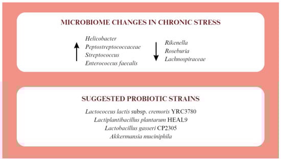 Chronic stress induces many adverse changes in the gastrointestinal tract such as the development of colitis, an increase in IL-6, a decrease in IL-10, damage to the intestinal mucosa, and dysbiosis. In terms of microbiota modulation, chronic stress results in increased levels of Helicobacter, Peptostreptococcaceae, Streptococcus, and Enterococcus faecalis. In turn, Rikenella, Roseburia, and Lachnospiraceae are decreased []. Adequate probiotic therapy can have positive effects on people living under chronic stress (Figure 2).