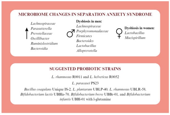 The topic of gut microbiota in the context of separation anxiety syndrome is poorly understood. Available studies mainly involve animal models. Separation from the mother promotes the development of defects in Paneth cells and intestinal dysbiosis, associated with E. coli among others, which lead to the development of visceral hypersensitivity [,]. Abnormalities of the HPA axis in separation anxiety are indicated, which may also be involved in the development of intestinal barrier dysfunction and exaggerated stress response []. Separation from the mother reduces microbial diversity. Lachnospiraceae, Parasutterella, Prevotellaceae, Oscillibacter, Ruminislostridium, and Bacteroidia are increased []. Difficult maternal experiences in early childhood may contribute to dysbiosis of Lachnospiraceae, Porphyromonadaceae, Firmicutes, Bacteroides, Lactobacillus, Alloprevotella in men and Lactobacillus and Mucispirillum in women []. Appropriate probiotic therapy can provide mental health benefits to people with separation anxiety syndrome (Figure 3).