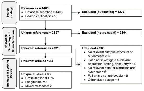 Overall, 34 articles were included in this review, 33 of which presented unique research studies. Most studies used a cross-sectional design (n = 27), followed by longitudinal (n = 5), and the remaining were mixed methods (n = 2). Most studies focused on one province only (n = 25), a few examined postsecondary students at the national level (n = 6), and two studies investigated mental health in multiple provinces. Regarding participants, all studies used self-report measures (n = 34), while most studies used web-based survey methods (n = 26) and reported their study population recruitment strategy (n = 22). A detailed summary of study characteristics can be found in the Supplementary Materials, and a flow diagram of the review process is shown in Figure 1.